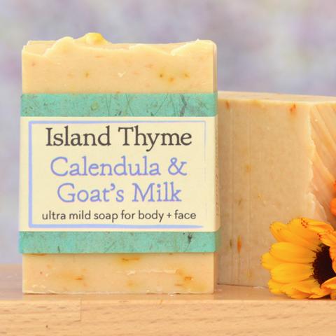 Ingredients: Saponified oils of olive, coconut, palm (sustainably harvested) and castor, fresh goat's milk, Island Thyme Farm calendula flowers, lavender essential oil, lemon essential oil.